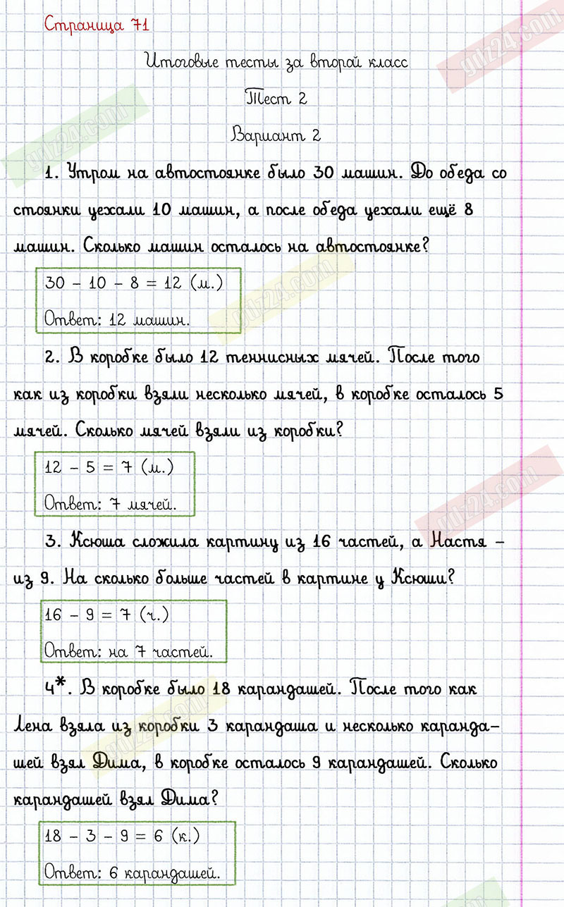 Подробные ответы к заданиям, расположенным на 71 странице проверочных работ по математике автора С.И. Волкова для учащихся 2 класса. Итоговый тест за второй класс. Тест 2, вариант 2.