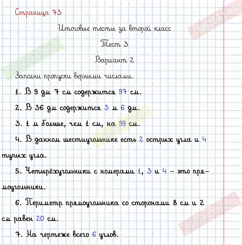Подробные ответы к заданиям, расположенным на 73 странице проверочных работ по математике автора С.И. Волкова для учащихся 2 класса. Итоговый тест за второй класс. Тест 3, вариант 2.