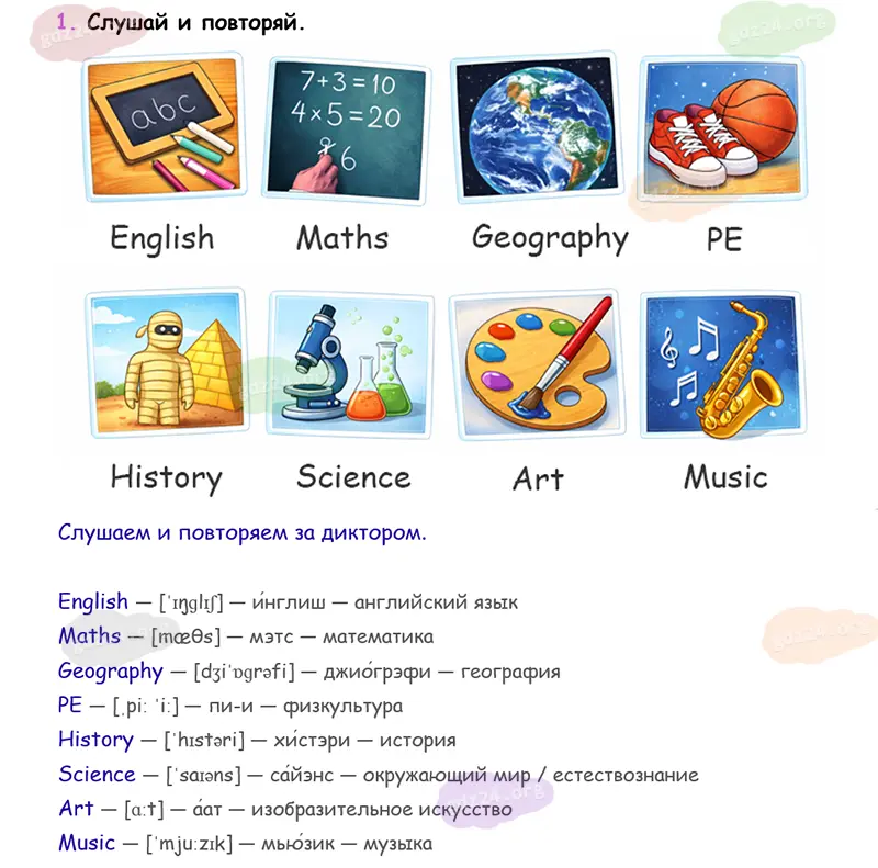 Подробные ответы к 1 заданию на 14 странице учебника Spotlight. Английский в фокусе. Н. И. Быкова, Д. Дули, М. Д. Поспелова и др. 2026 года ФГОС, 3 класс 1 часть. Module 1. School days! 2.a. School subjects!