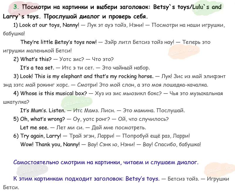 Подробные ответы к 3 заданию на 61 странице учебника Spotlight. Английский в фокусе. Н. И. Быкова, Д. Дули, М. Д. Поспелова и др. 2026 года ФГОС, 3 класс 1 часть. Module 4. Come in and play! 7.a. Toys for little Betsy!