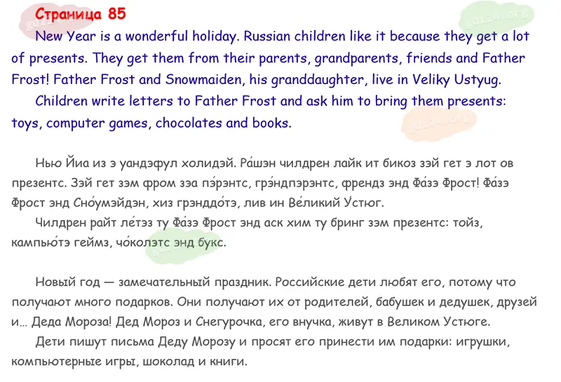 Подробные ответы к 85 странице учебника Spotlight. Английский в фокусе. Н. И. Быкова, Д. Дули, М. Д. Поспелова и др. 2026 года ФГОС, 3 класс 1 часть. Module 4. Russia. 4. Everybody likes presents!