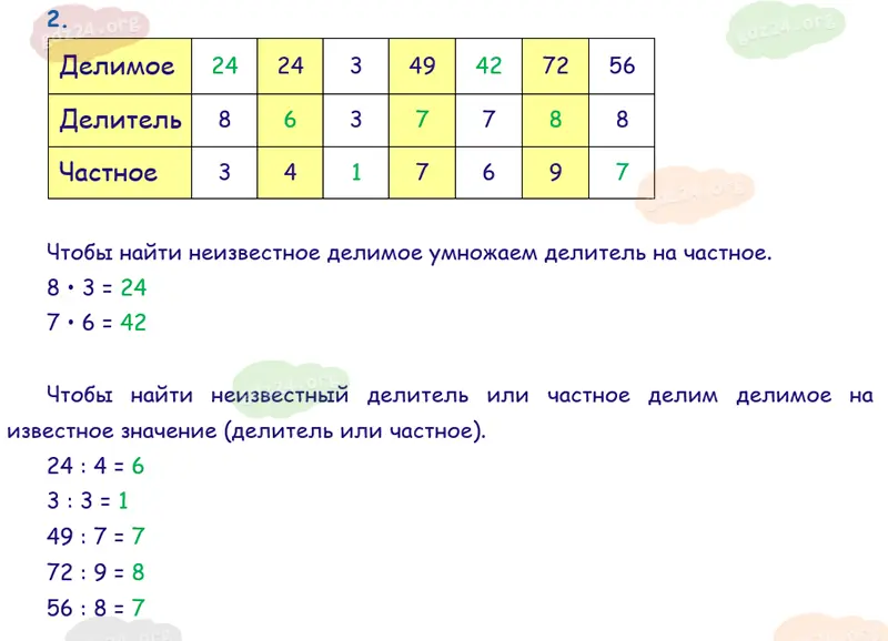 Подробные ответы к 2 заданию на 62 странице учебника по математике М. И. Моро 2026 года ФГОС, 3 класс 1 часть. Умножение и деление с числами 8 и 9.