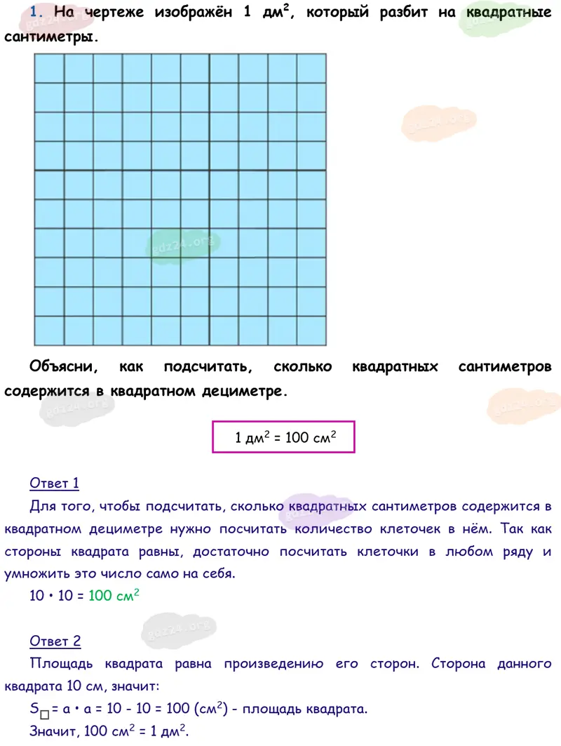 Подробные ответы к 1 заданию на 63 странице учебника по математике М. И. Моро 2026 года ФГОС, 3 класс 1 часть. Квадратный дециметр.