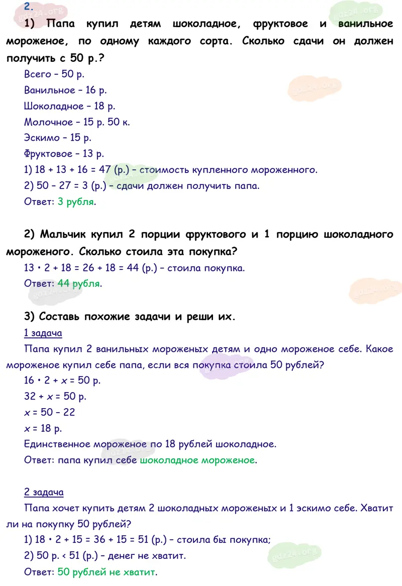 Подробные ответы к 2 заданию на 69 странице учебника по математике М. И. Моро 2026 года ФГОС, 3 класс 1 часть. Страничка для любознательных. Задачи-расчёты.