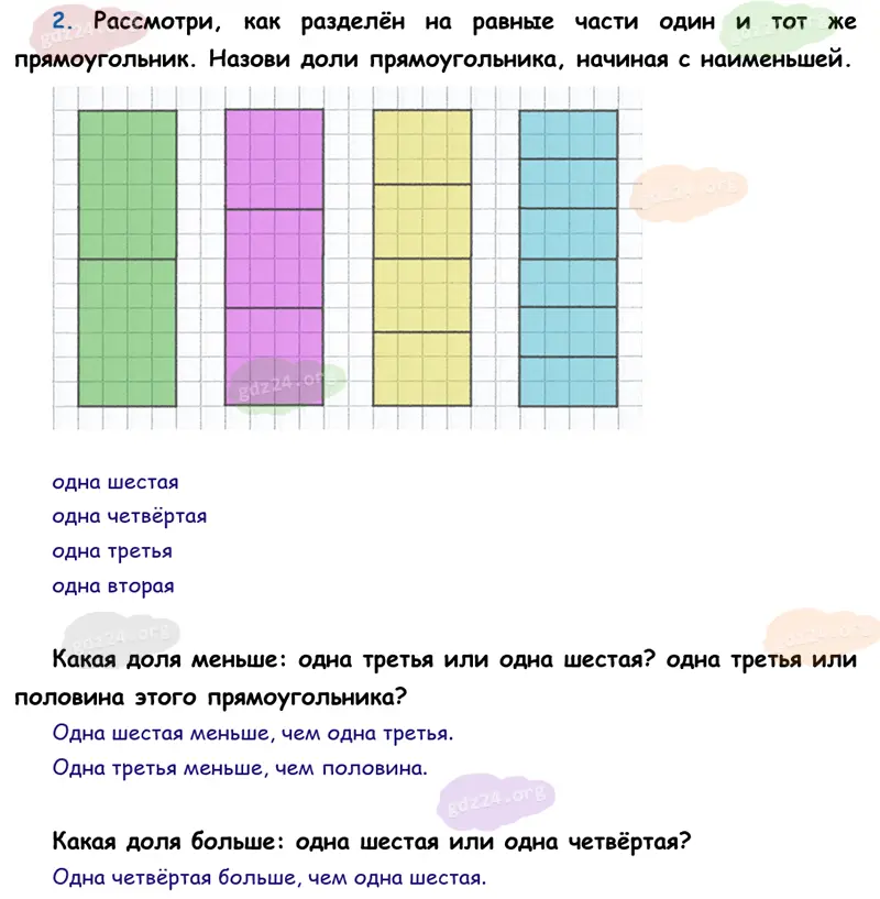 Подробные ответы к 2 заданию на 92 странице учебника по математике М. И. Моро 2026 года ФГОС, 3 класс 1 часть. Доли.