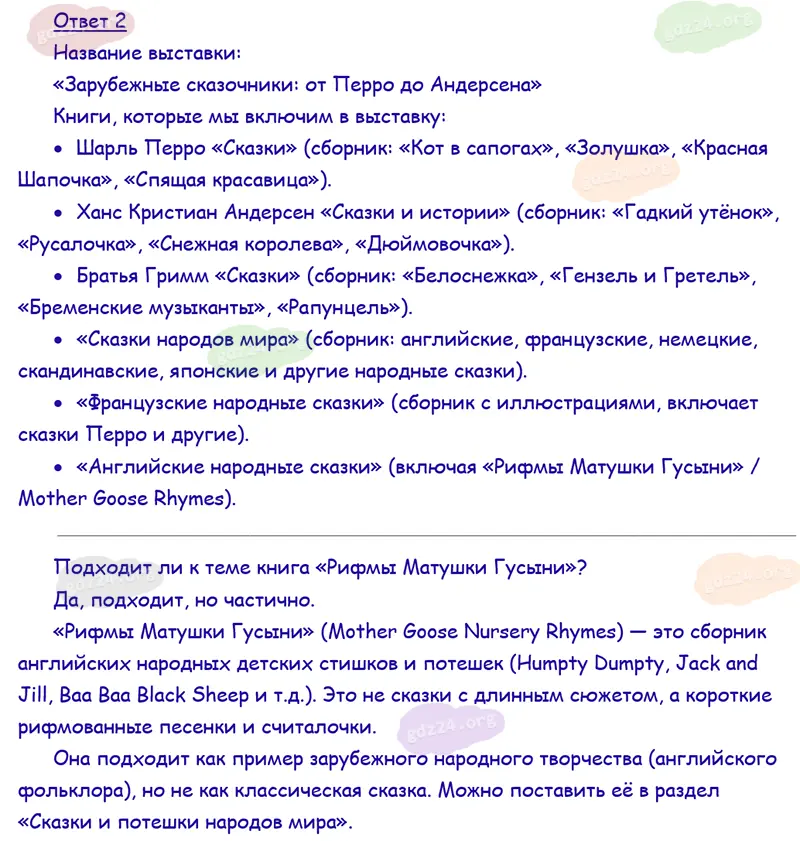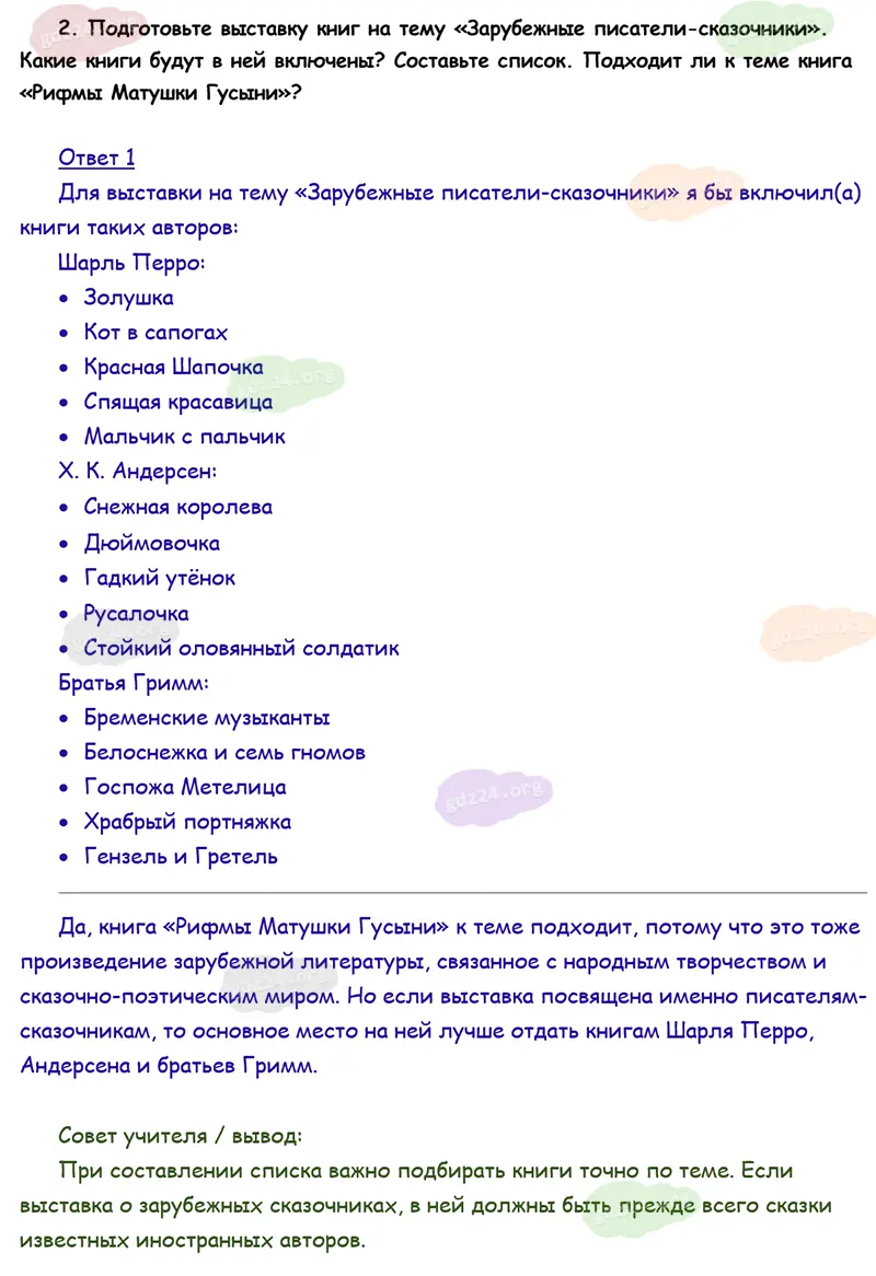 Подробные ответы к 2 заданию на 123 странице учебника по литературному чтению Климанова Л. Ф., Горецкий В. Г., Голованова М. В. и др. 2026 года ФГОС, 4 класс 2 часть. Зарубежная литература. В мире книг.