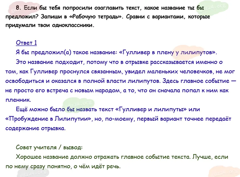 Подробные ответы к 8 заданию на 130 странице учебника по литературному чтению Климанова Л. Ф., Горецкий В. Г., Голованова М. В. и др. 2026 года ФГОС, 4 класс 2 часть. Зарубежная литература. Свифт Дж. Путешествия Гулливера.