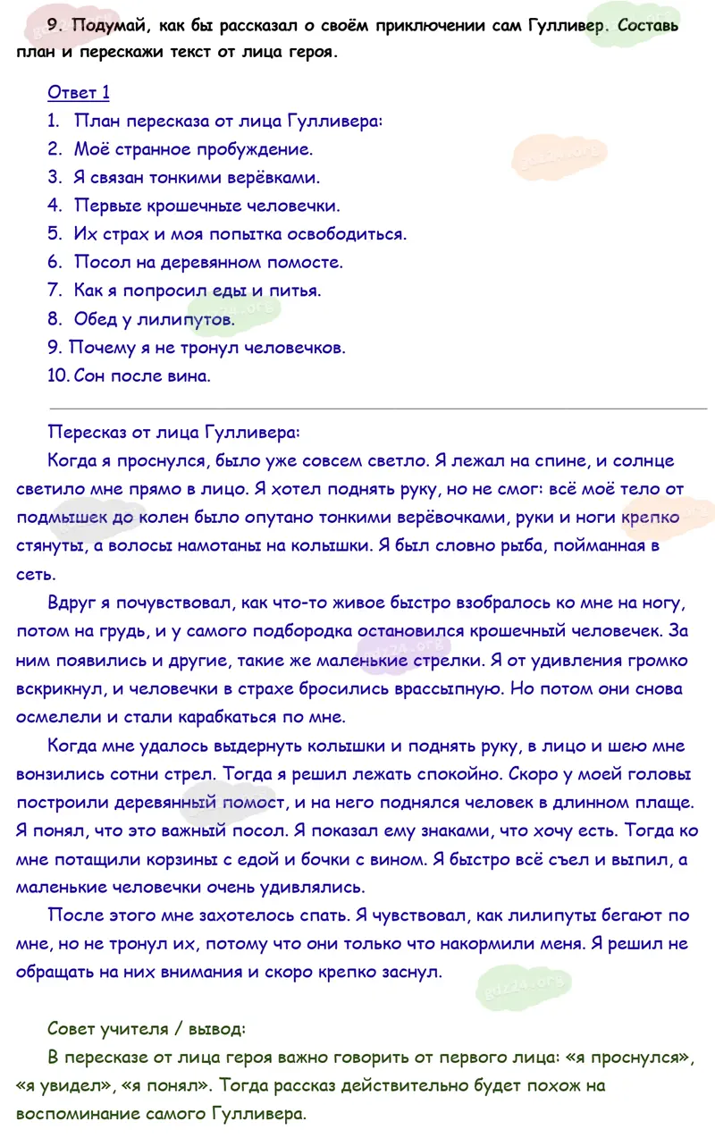 Подробные ответы к 9 заданию на 130 странице учебника по литературному чтению Климанова Л. Ф., Горецкий В. Г., Голованова М. В. и др. 2026 года ФГОС, 4 класс 2 часть. Зарубежная литература. Свифт Дж. Путешествия Гулливера.
