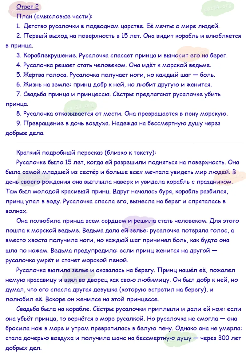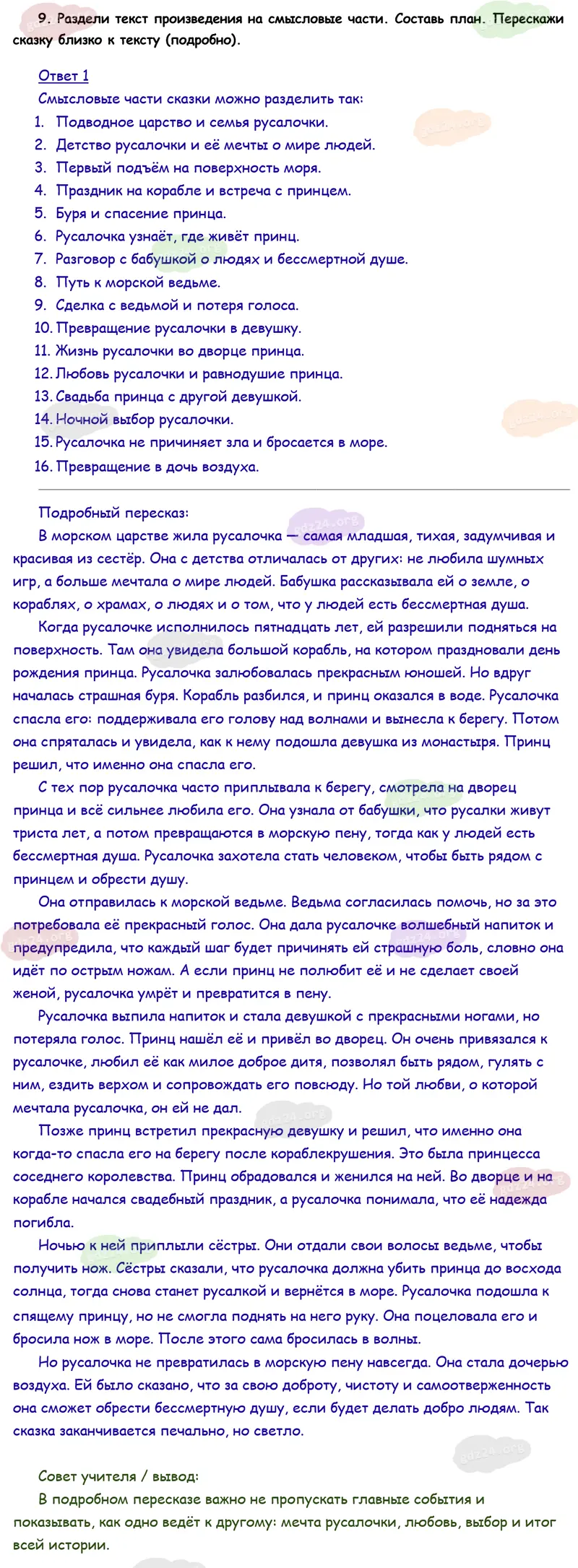 Подробные ответы к 9 заданию на 149 странице учебника по литературному чтению Климанова Л. Ф., Горецкий В. Г., Голованова М. В. и др. 2026 года ФГОС, 4 класс 2 часть. Зарубежная литература. Андерсен X. К. Русалочка.