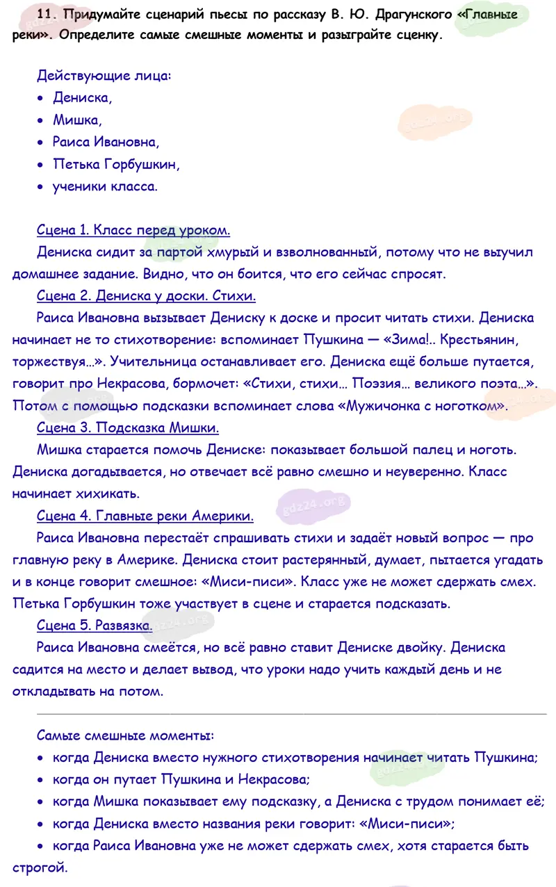 Подробные ответы к 11 заданию на 21 странице учебника по литературному чтению Климанова Л. Ф., Горецкий В. Г., Голованова М. В. и др. 2026 года ФГОС, 4 класс 2 часть. Делу время — потехе час. Драгунский В. Ю. Главные реки.