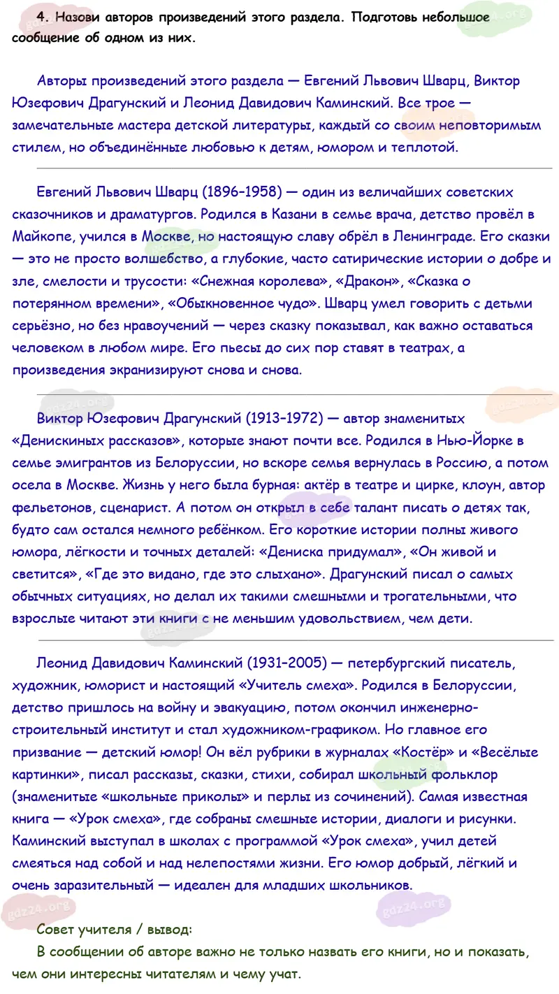 Подробные ответы к 4 заданию на 26 странице учебника по литературному чтению Климанова Л. Ф., Горецкий В. Г., Голованова М. В. и др. 2026 года ФГОС, 4 класс 2 часть. Делу время — потехе час. Проверим себя.