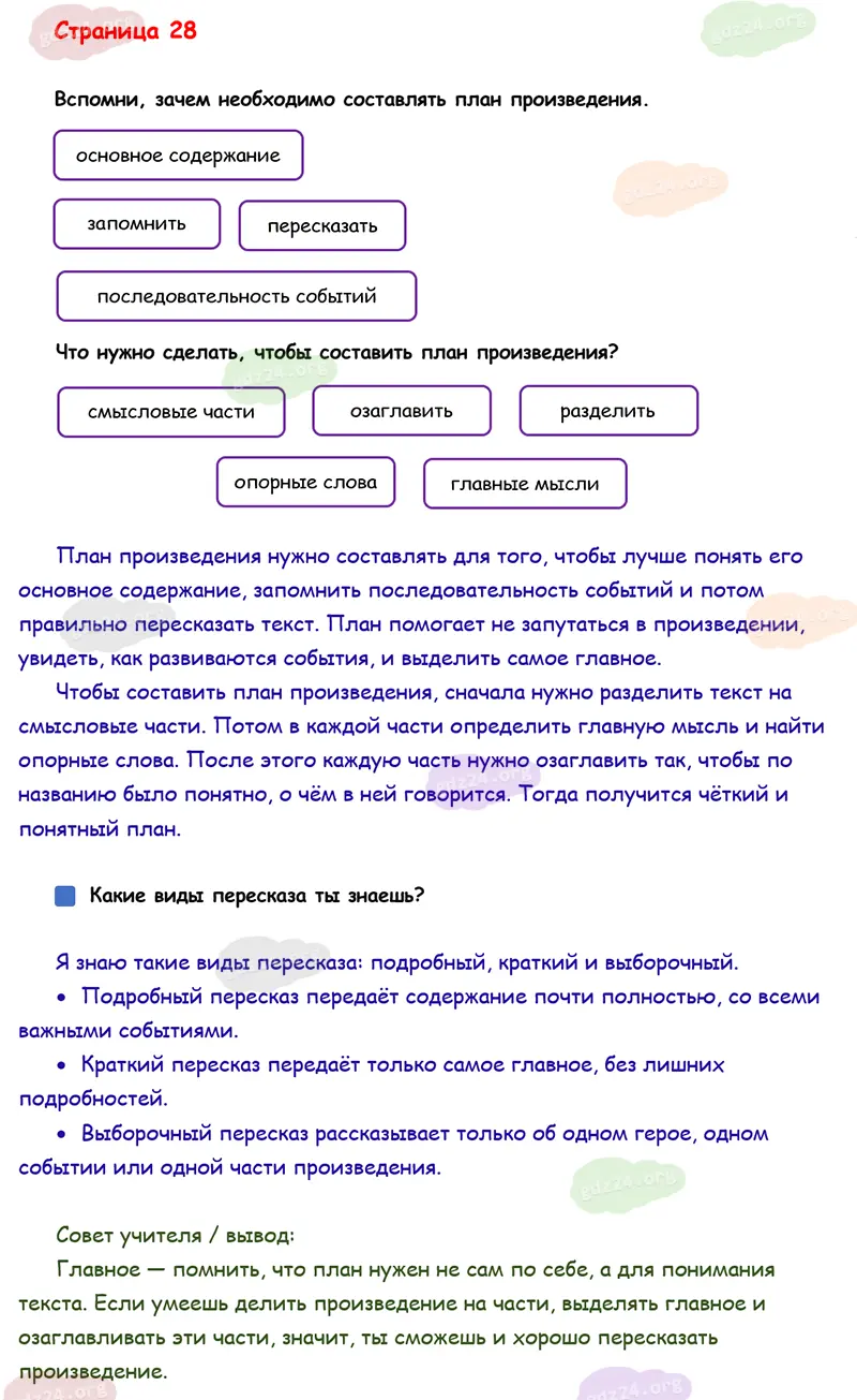 Подробные ответы к заданию на 28 странице учебника по литературному чтению Климанова Л. Ф., Горецкий В. Г., Голованова М. В. и др. 2026 года ФГОС, 4 класс 2 часть. Страна детства. Что уже знаем и умеем.