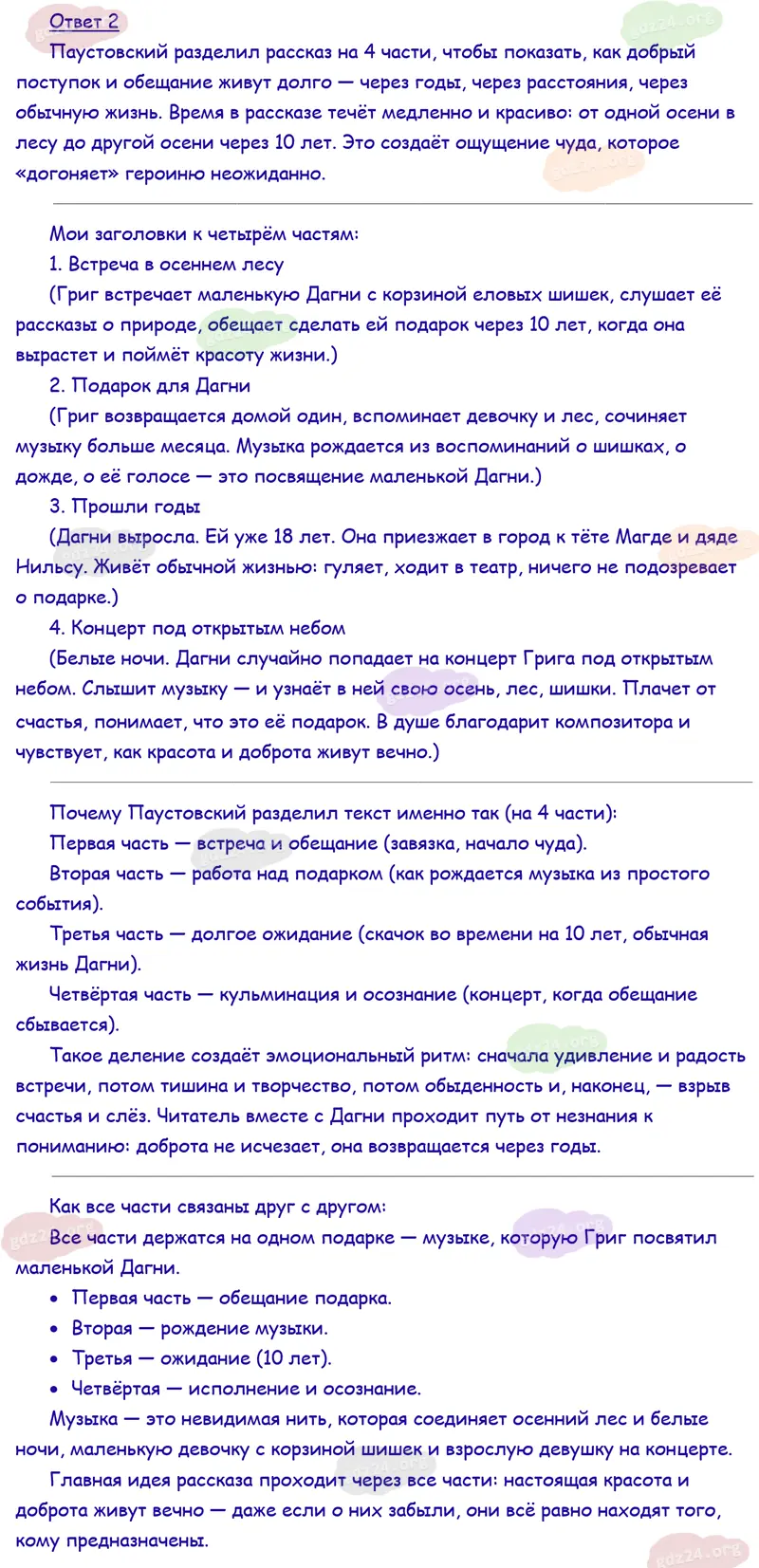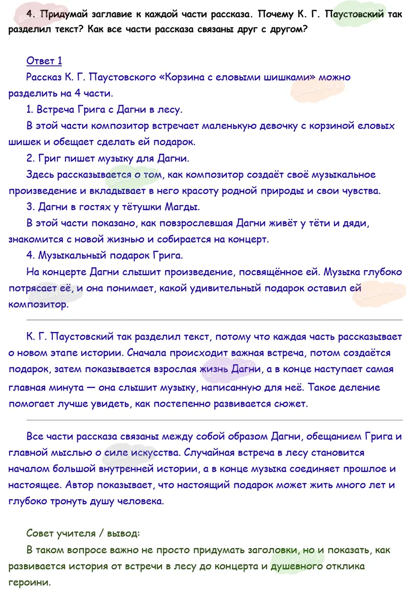 Подробные ответы к 4 заданию на 45 странице учебника по литературному чтению Климанова Л. Ф., Горецкий В. Г., Голованова М. В. и др. 2026 года ФГОС, 4 класс 2 часть. Страна детства. Житков Б. С. Паустовский К. Г. Корзина с еловыми шишками.