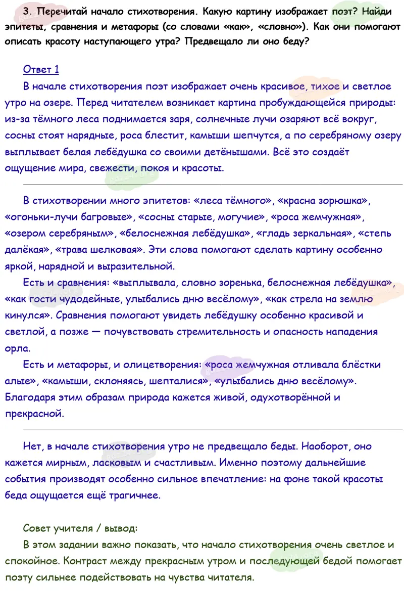 Подробные ответы к 3 заданию на 72 странице учебника по литературному чтению Климанова Л. Ф., Горецкий В. Г., Голованова М. В. и др. 2026 года ФГОС, 4 класс 2 часть. Природа и мы. Есенин С. А. Лебёдушка.