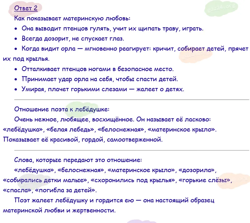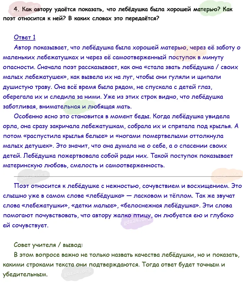 Подробные ответы к 4 заданию на 72 странице учебника по литературному чтению Климанова Л. Ф., Горецкий В. Г., Голованова М. В. и др. 2026 года ФГОС, 4 класс 2 часть. Природа и мы. Есенин С. А. Лебёдушка.