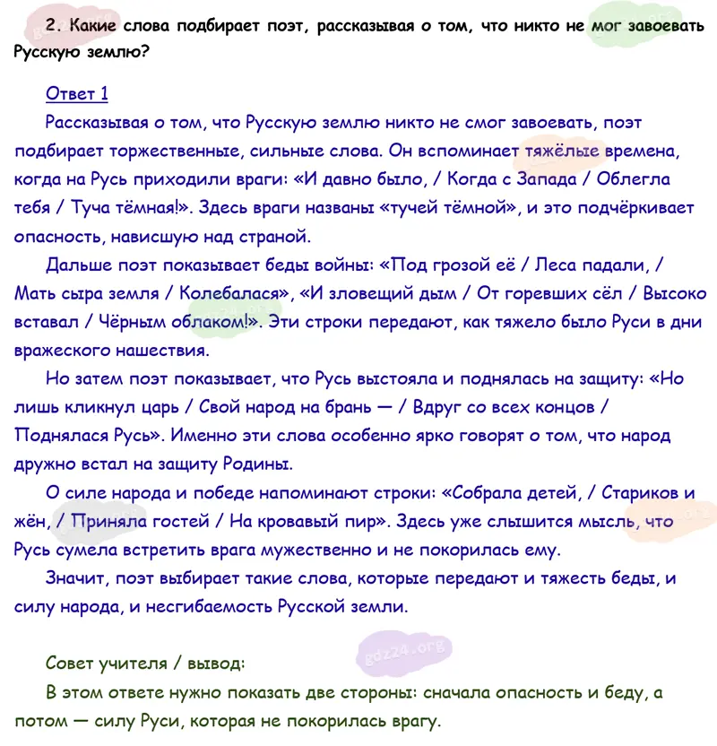 Подробные ответы к 2 заданию на 95 странице учебника по литературному чтению Климанова Л. Ф., Горецкий В. Г., Голованова М. В. и др. 2026 года ФГОС, 4 класс 2 часть. Родина. Никитин И. С. Русь.